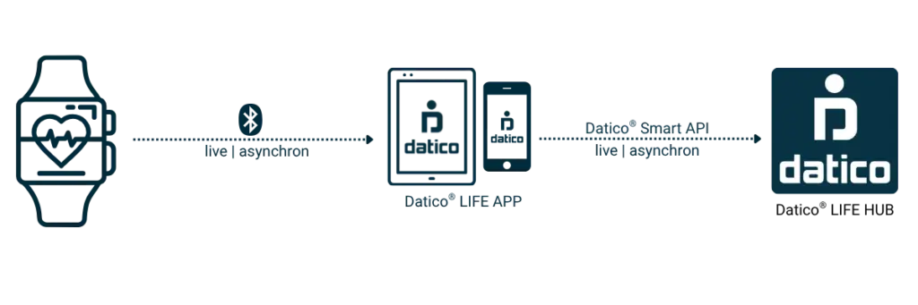 Wearable Connect Pro eliminiert die Abhängigkeit von Hersteller-Clouds vollständig. Die Daten werden direkt zwischen Wearable und Datico® LIFE APP übertragen und anschließend kontrolliert in den Datico® LIFE HUB integriert.
